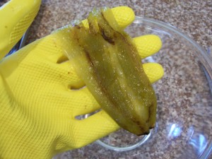 Step 6 – Peel blackened skins away from chili flesh. Be sure to wear gloves to protect your hands (trust me, don’t ignore this part). The skin should peel easily. If you have areas that won’t peel, use a sharp knife to gently scrape flesh from skin.